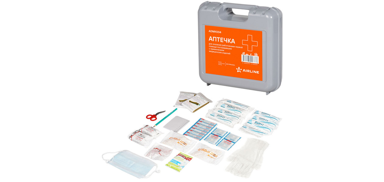 В аптечку входят: две медицинские нестерильные одноразовые маски, две пары медицинских нестерильных перчаток (размером не менее М), два устройства для проведения искусственного дыхания, один жгут для остановки артериального кровотечения, четыре марлевых бинта размером не менее 5 × 10 см, четыре марлевых бинта размером минимум 7 × 14 см, две упаковки марлевых стерильных салфеток размером от 16 × 13 см.