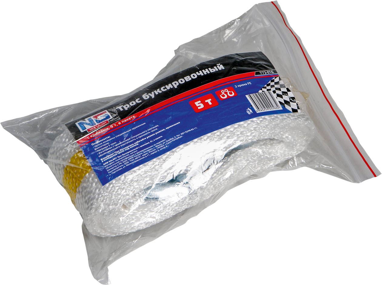 На упаковке троса указано, что усилие на разрыв в два раза превышает необходимые нормы и трос относится к А-классу. Однако согласно какому нормативному документу — найти не удалось. Трос изготовлен из полипропиленовой нити оранжевого цвета, сплетенной в канат. Продается в комплекте с сумкой, на которой заявлено, что трос соответствует ПДД, однако предупреждающих флажков в комплекте нет.