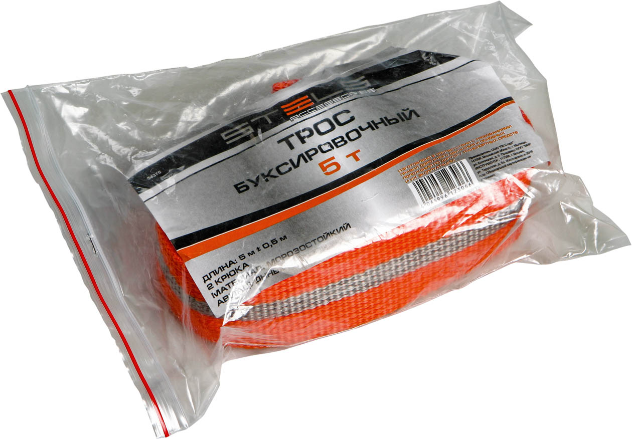 Трос-лента из полипропиленовой нити оранжевого цвета. Трос поставляется без дополнительной комплектации. На этикетке указано, что перед эксплуатацией трос необходимо дооснастить согласно ПДД.