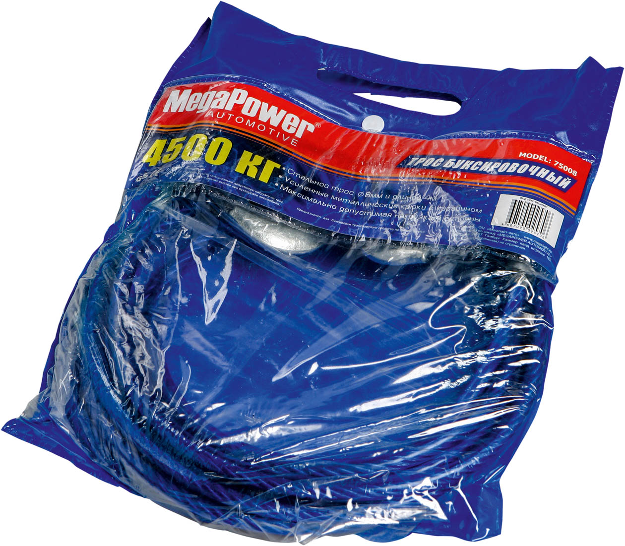 Трос с заявленной максимальной нагрузкой 4,5 тонны изготовлен из стального каната с двумя крюками, защищенного силиконовой оплеткой синего цвета. Концы каната обжаты алюминиевыми наконечниками. В комплекте с тросом поставляется хлипкая сумочка, которая легко рвется при попытке уложить в нее трос после использования.