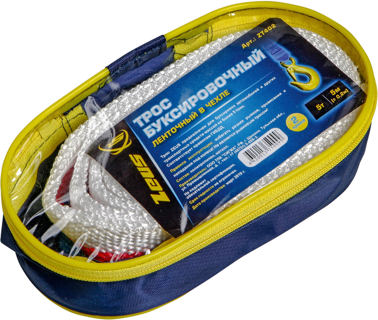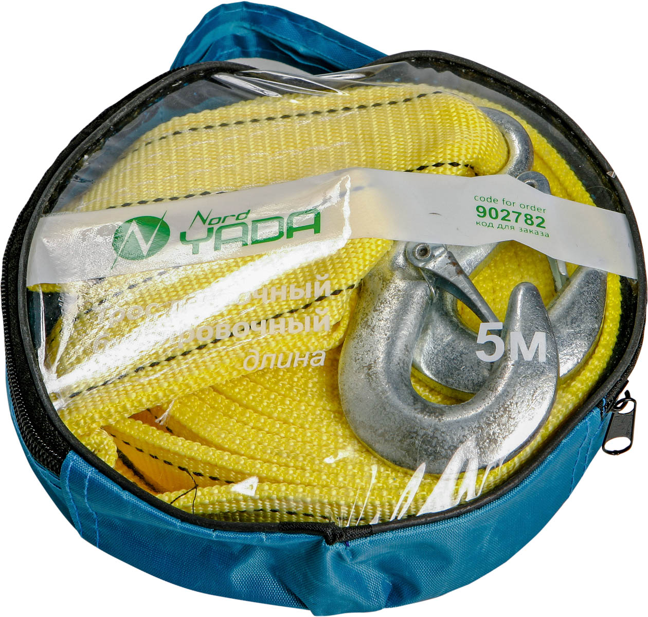 Единственный китайский представитель в нашем тесте. В комплекте с тросом поставляется сумочка на молнии для хранения троса-ленты желтого цвета. Внутри упаковки на наклейке есть информация, что перед эксплуатацией трос необходимо оснастить согласно ПДД. Трос-лента лимонного цвета выглядит мощно: по всей длине он сшит из двух лент.