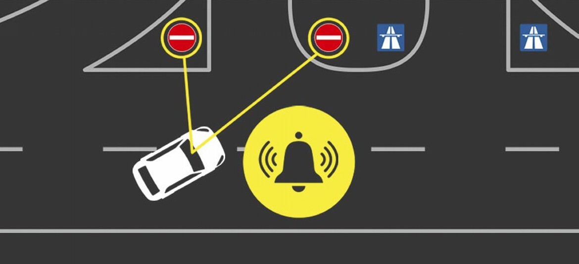 Если водитель проезжает между двумя знаками «проезд запрещен», установленными на подъездной дороге автомагистрали, система Wrong Way Alert подает звуковой сигнал и выводит на приборную панель изображение запрещающего проезд знака, а также текстовое сообщение с предложением проверить правильность направления движения.