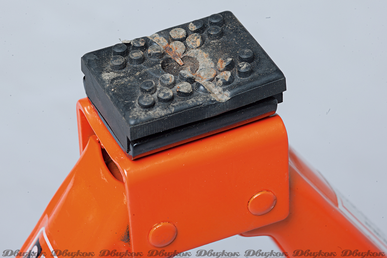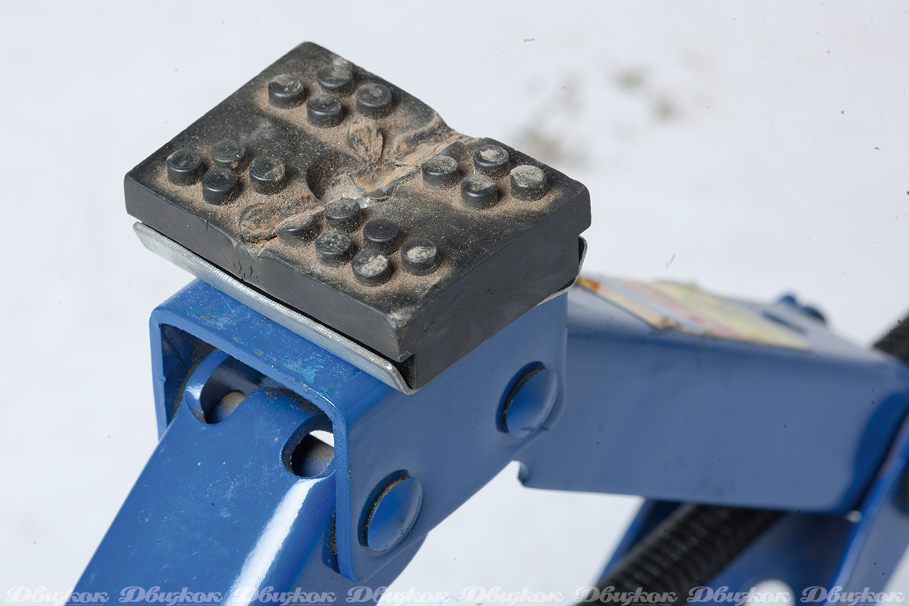 После седьмого поднятия из строя вышел домкрат AIRLINE — произошла деформация зубьев в шарнирном соединении. Также получила повреждения от порога жесткая накладка, которая прикручена к опорной площадке.