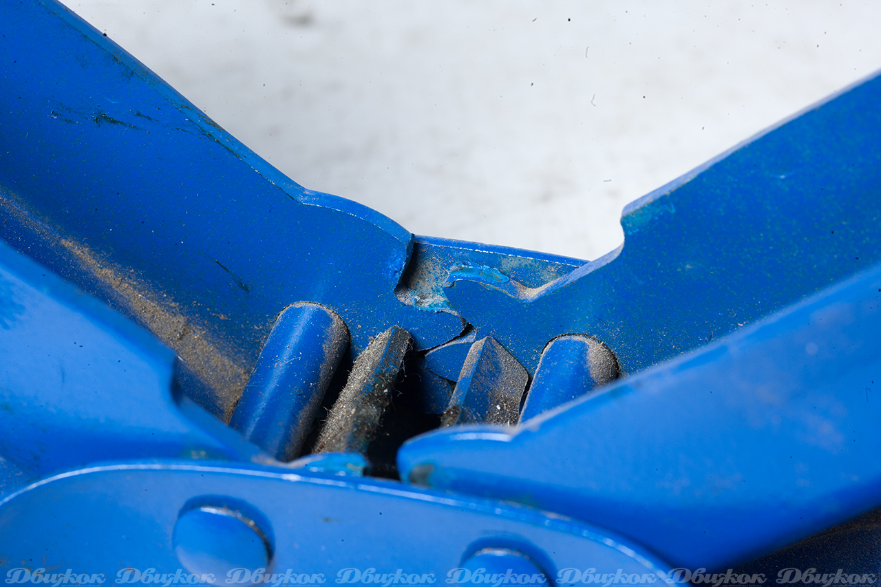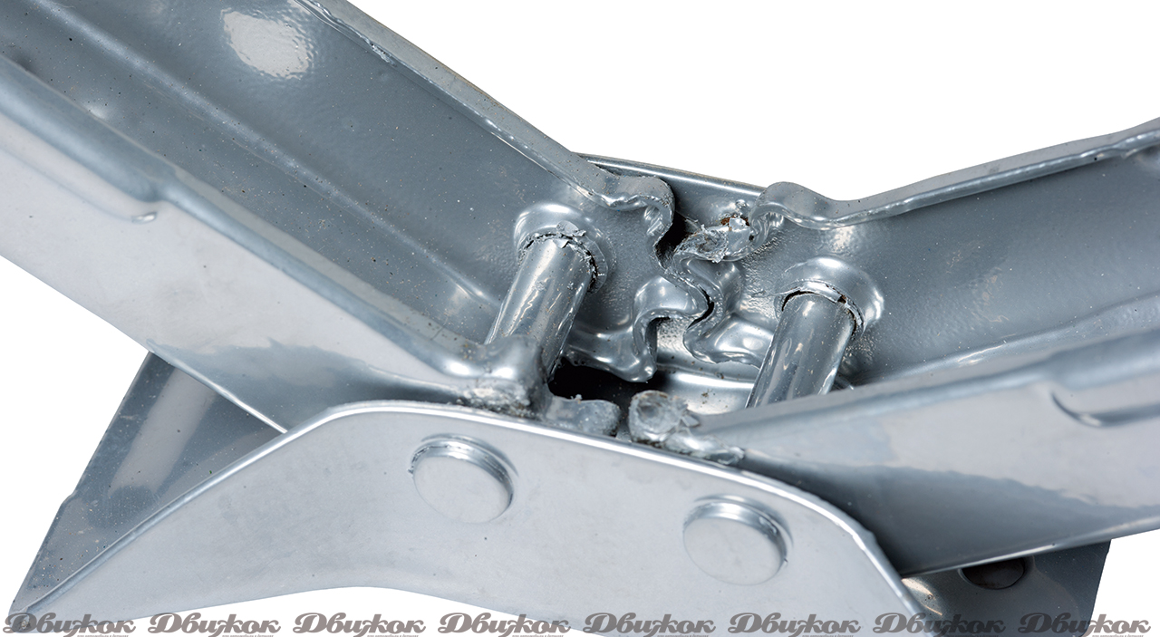 При покупке этого массивного с виду домкрата нам показалось, что он выдержит не 1,5, а все 2,5 тонны. Продавец уверял, что зубья усилены за счет дополнительной вставки, однако между вставкой и зубом есть зазоры по 1—2 мм, что приведет к тому, что при изгибе зуба он просто упрется в данную вставку и заклинит. У этого домкрата широкая опорная площадка, которая, как обнаружилось при установке его на ровную поверхность, неровная, и домкрат имеет возможность качаться. На опорной площадке есть только небольшое углубление посередине, выполненное штамповкой, никаких накладок для предотвращения повреждения кузова не предусмотрено. Толщина металла рычагов составляет 2,5 мм, зубья плоские, такой же толщины. К домкрату прилагается Z-образная нескладная ручка-крючок — она неудобна при использовании из нижнего положения.
