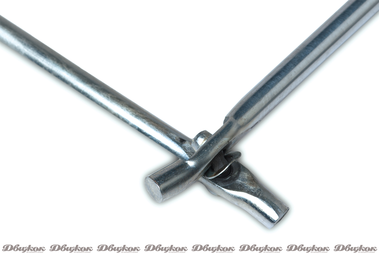 Этот ромбический домкрат имеет упаковку, на которой указано, что минимальная высота подхвата составляет 104 мм, а максимальная высота подъема — 385 мм. В упаковке лежала только складная ручка-крючок с обрезиненной рукояткой, которая вращается при вращении ручки-крючка. Ручка-крючок фиксируется только в одном положении, что не очень удобно, так как у остальных испытуемых ручку можно повернуть под любым углом. Опорная площадка металлическая, под форму порога, никаких накладок не предусмотрено. Зубья в шарнирных соединениях домкрата выполнены штамповкой, они имеют ширину 6 мм, однако толщина металла, из которого сделаны рычаги и зубья, составляет 2 мм.