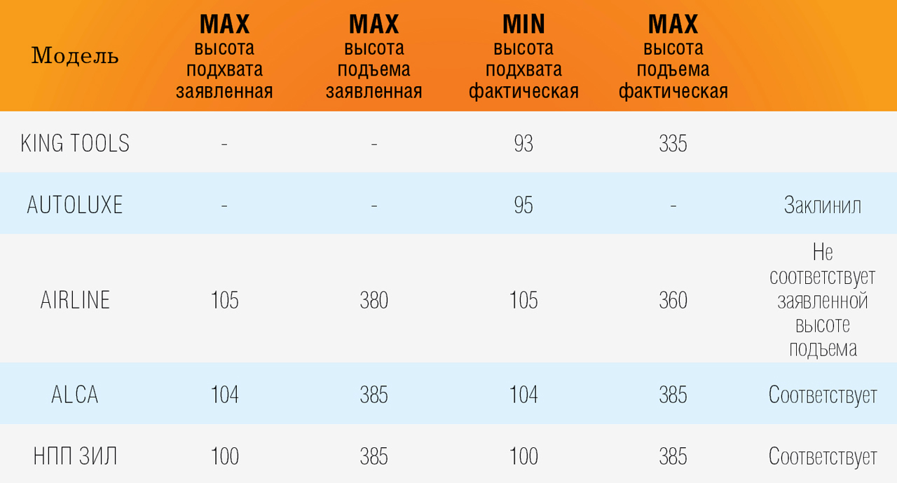 В таблице представлена заявленная и фактическая минимальная и максимальная высота домкратов.