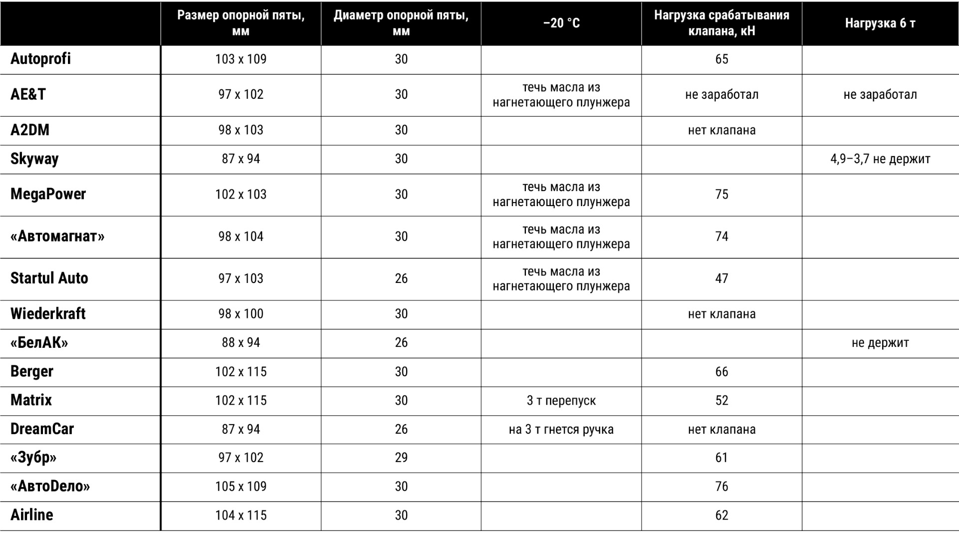 Skyway, «БелАК», Matrix, Startul Auto — домкраты сбрасывают нагрузку при достижении свыше 4 тонн. У Matrix перепускной клапан настроен на нагрузку 5,2 тонны, при этом слитое из домкрата масло было самым грязным из всех.
