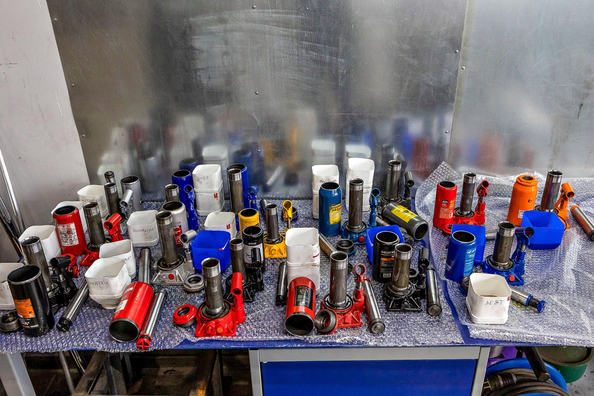 На финальном этапе мы разобрали все домкраты для внутреннего осмотра на предмет аккуратности сборки, наличия грязи, стружки и визуальной оценки слитого масла.