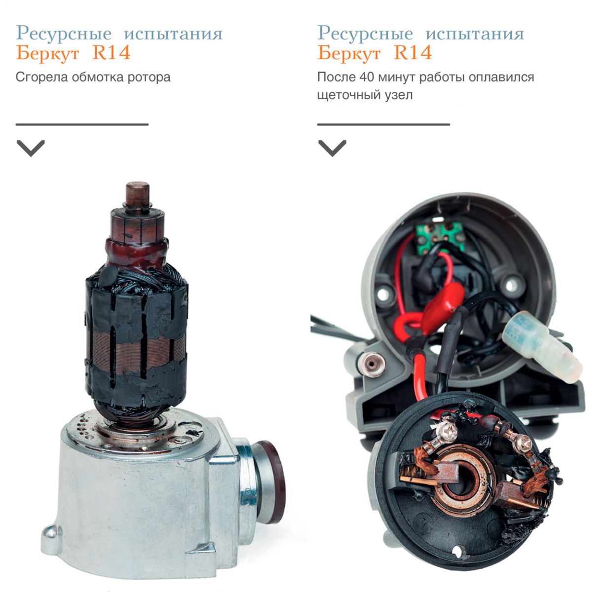 На ресурсных испытаниях «Беркут» вышел из строя первым, проработав всего лишь 40 минут, после чего все почувствовали характерный едкий запах. Вскрытие показало, что сгорела обмотка ротора и оплавился щеточный узел. При этом тепловая защита (почему-то) никоим образом себя не проявила.