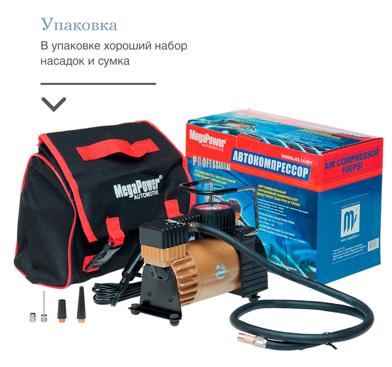 Является практически точной копией компрессора Megapower 03.14.001. Компрессор также упакован в картонную коробку с пенопластовыми вставками. А вот к инструкции по применению сразу же возникли претензии: нечеткое изложение, а некоторое вопросы и вовсе не понятны. Ко всему прочему, в инструкции указаны внесистемные единицы измерения, подходящие разве что для Великобритании. Гарантийный талон отсутствует.