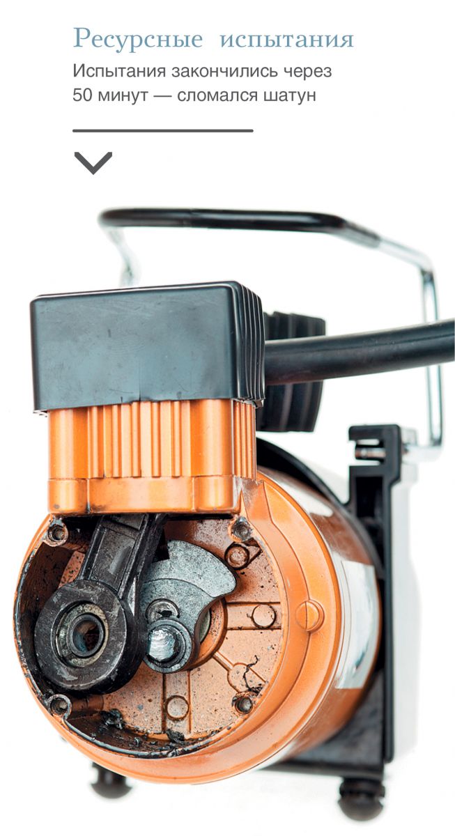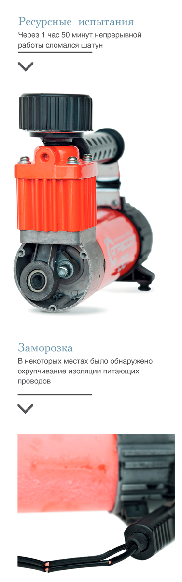 На циклических испытаниях у данного компрессора наблюдалась повышенная вибрация, вследствие чего один из крепежных винтов попросту выпал. Из-за перегрева периодически кнопка включения/выключения становилась мягкой.