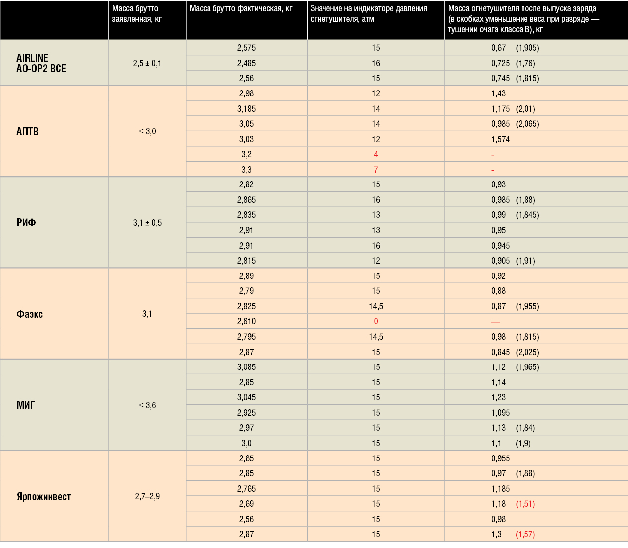 Согласно ГОСТу, масса заряда для порошковых огнетушителей может отличаться не более чем на 5%, то есть в нашем случае масса заправленного порошка должна быть 2,0 ± 0,1 кг. Наиболее стабильными по количеству заправки оказались порошковые огнетушители производителей Airline и «РИФ» — разброс массы между купленными нами огнетушителями составляет менее 100 г, «МИГ» — 235 г, «Фаэкс» — 280 г, а «Ярпожинвест» и «АПТВ» — более 300 г, что может свидетельствовать о несоответствии необходимой и фактически заправленной массы порошка.