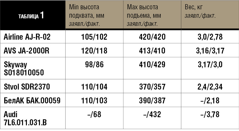 По результатам испытаний видно, что наименьшую высоту подхвата и наибольшую высоту подъема обеспечил штатный домкрат Audi. Но он оказался и самым тяжелым в тесте. Домкрат Stvol завышает заявленные показатели подъема от фактических на 13 мм, а Skyway занижает на 19 мм.