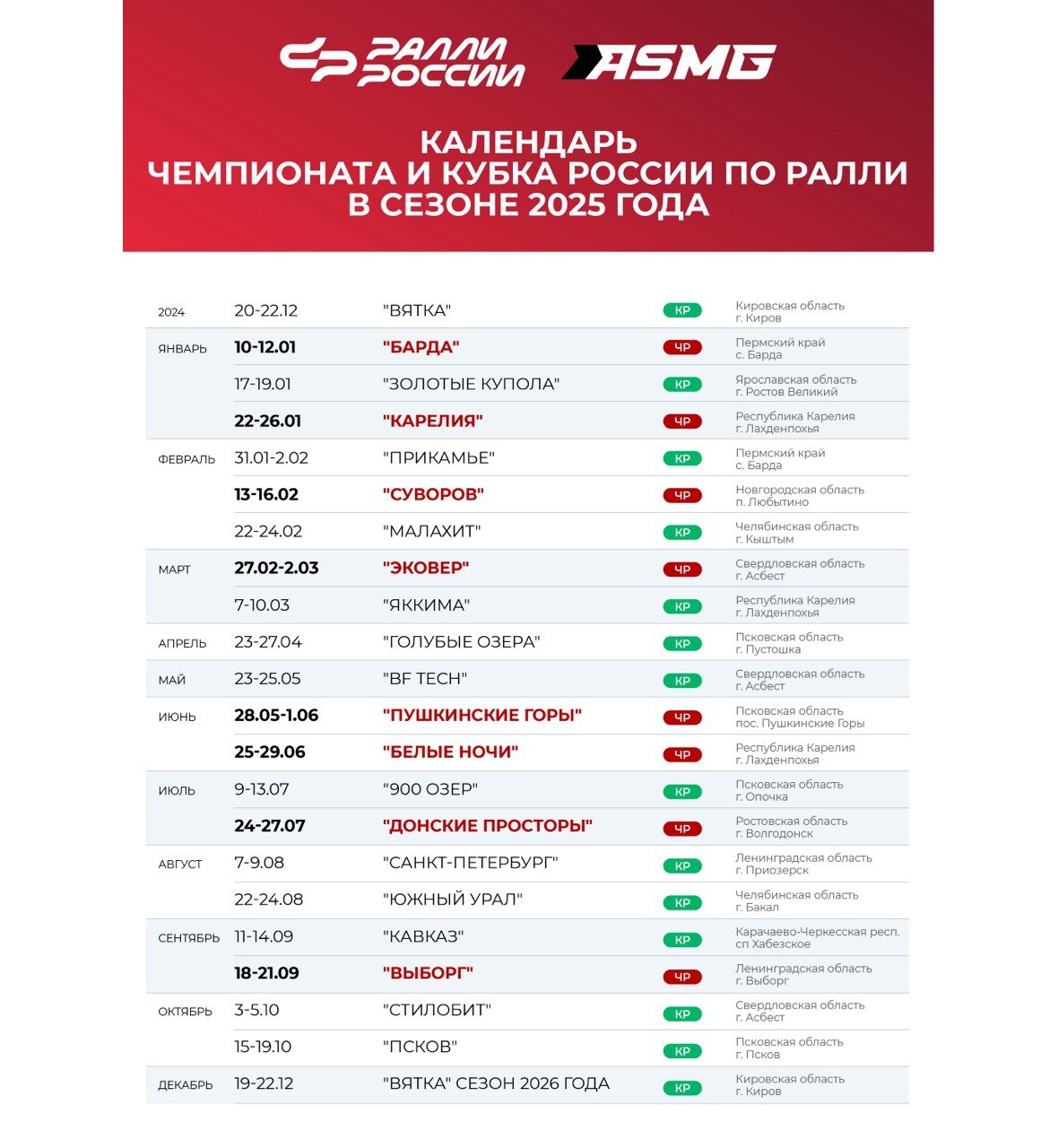 Гонки, проходящие в Псковской области – «Псков» и «Пушкинские горы» – в 2025 году поменяются местами и статусом: «Ралли Псков» пройдет в октябре в ранге финала Кубка России, «Пушгоры» займут освободившийся весенний слот в чемпионате