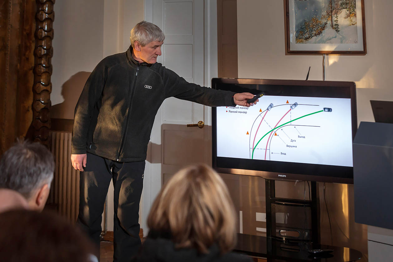 Первый день выполнения и повторения тренировочных заданий проходит почти без замечаний в сторону нашего экипажа. И это очень большой комплимент от Евгения Васина и пилотов-тренеров его школы. В прошлом, и особенно в позапрошлом году, когда нам довелось впервые побывать на Audi Winter Experience, рация в машине была буквально раскалена от количества «поправок» наших ошибок. Оказалось, что, несмотря на 15-летний стаж вождения, водить машину «правильно» нам еще только предстояло научиться. И вот на третий год появляется приятное и растекающееся теплом чувство, что все это было не зря.