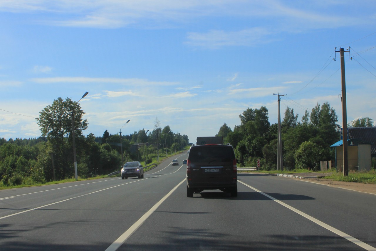 Съезд с главной, идеально ровной магистрали тут же возвращает в мир провинциальных российских дорог, поддерживающихся в приемлемом состоянии по мере редкой возможности. Дорога до Демьянска представляет собой залатанную стиральную доску, где швы, трещины и впадины чередуются с горбами давнего ямочного ремонта - держать скорость свыше 80 км/ч тут трудно, поскольку в одной из неожиданных колдобин можно оставить если не подвеску, то колесо точно. А ведь от трассы М10 до конечного пункта назначения ни много ни мало ещё около 200 км. При таком темпе движения это означает не меньше трех часов пути. Радует только то, что дорога эта почти на всём протяжении пустая, так что главная задача внимательно уходить от ям-ловушек.