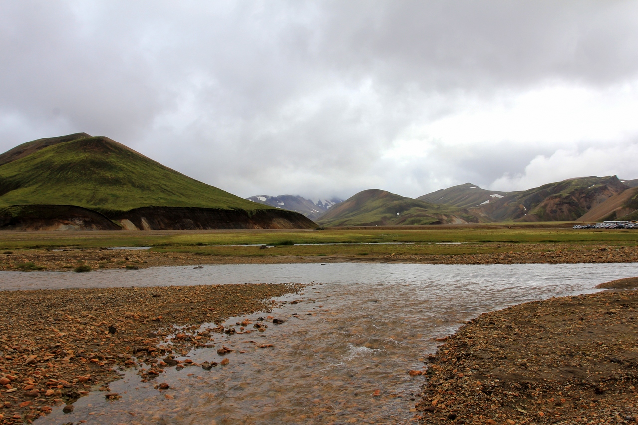 Небольшой брод на подъезде к долине Ландманналаугар…и все те, кто не решился его пересекать, поскольку до кемпинга всего километр пешком.