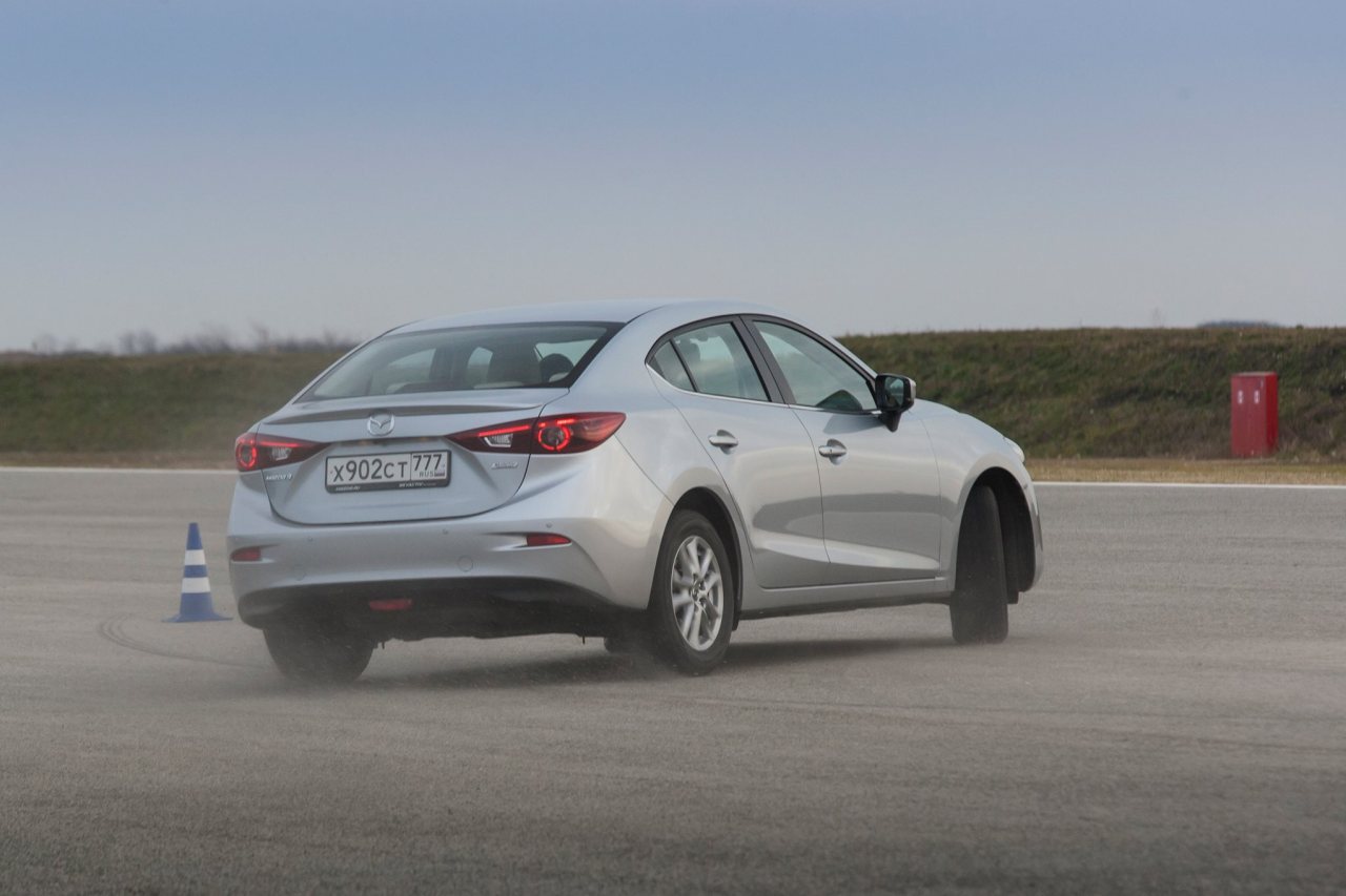 Задавать направление точным рулем послушной и легкой Mazda3 было несложно. Главная проблема задания заключалась в контроле именно заносов. Японские седаны действительно легко срывались в скольжение с первого же конуса, однако дальше была необходима филигранная работа акселератором — ослабишь напор и машина на сухом асфальте быстро стабилизируется, переборщишь — и тебя тут же развернет, или снесешь конус «провалившейся» кормой. И то, и другое — незачет. Причем, даже если неплохо начнешь выполнение задания, продержаться ровно и под полным контролем до самого конца получилось не у всех.