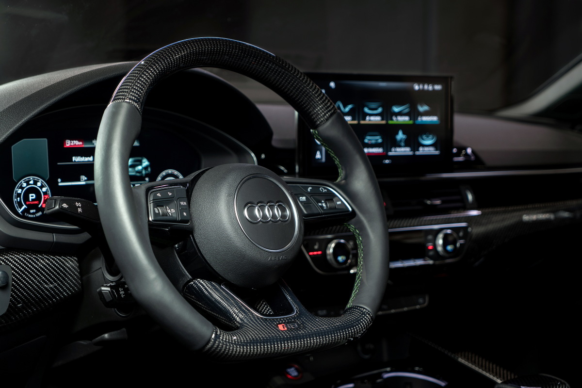 Декоративные вставки из того же материала применены и в салоне форсированного RS 5; кроме того, из него изготовлены каркасы сидений; руль и селектор трансмиссии обшиты кожей тонкой выделки.