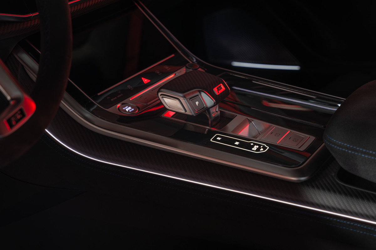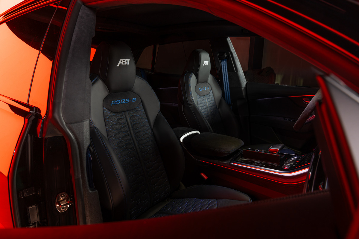 В комплект доработок интерьера вошли обновленные сиденья, руль и клавиша запуска двигателя с логотипами ателье, углепластиковый селектор коробки передач; эмблемы ABT и RSQ8-S размещены также на подсвечиваемых накладках на пороги и ковриках в салоне и багажнике.