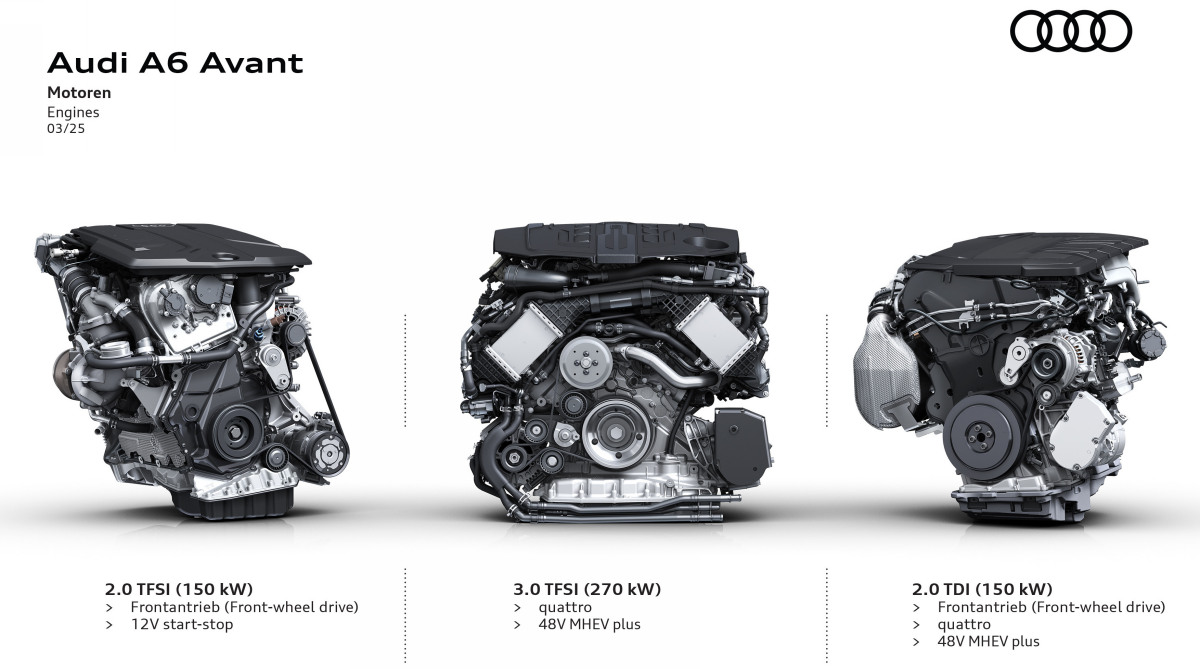 Базовым для нового A6 Avant станет 4-цилиндровый бензиновый мотор 2.0 TFSI мощностью 204 л.с., оснащенный 12-вольтовой системой Start-Stop и вращающий исключительно передние колеса.