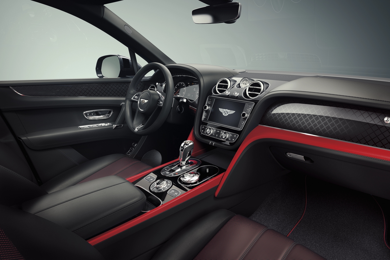Новые детали из углеродного волокна, расположенные на приборной панели автомобиля, были разработаны специально для серии Bentayga V8 Design, уточняет производитель. В центре передней панели расположились часы Breitling с бриллиантами и перламутровым циферблатом.