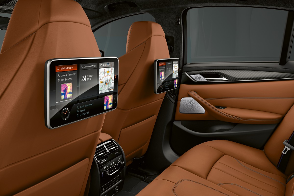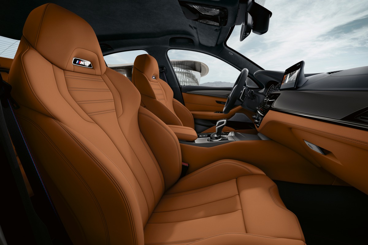 Внутри новый M5 Competition получил спортивные передние кресла, обшитые натуральной кожей Merino Aragon, декоративные вставки из темного алюминия на передней панели, ремни безопасности с логотипами BMW M, коврики со специальной окантовкой и логотипом «М5»; на экране приборной панели при запуске двигателя появляется надпись «М Competition».