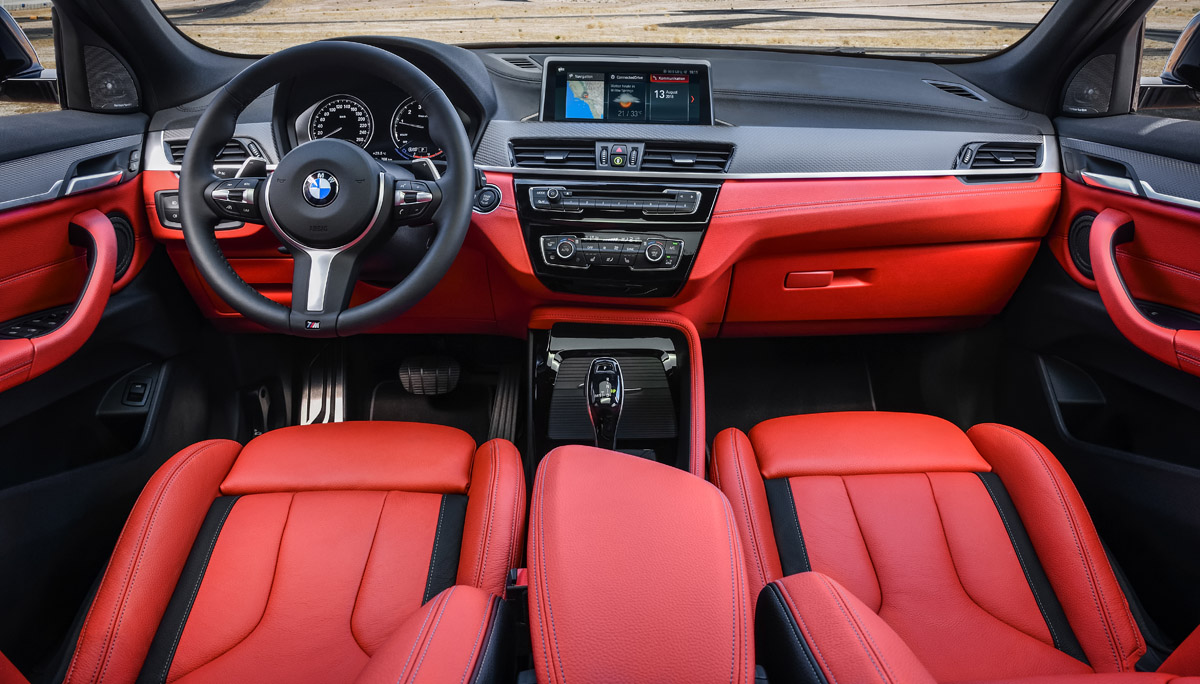 Интерьер нового X2 M35i оформлен в характерном для моделей M серии спортивном стиле; в стандартную комплектацию входяит пакет отделки M Sport Package, кожаный руль с подрулевыми переключателями передач, а также накладки на пороги с логотипами “M35i”.