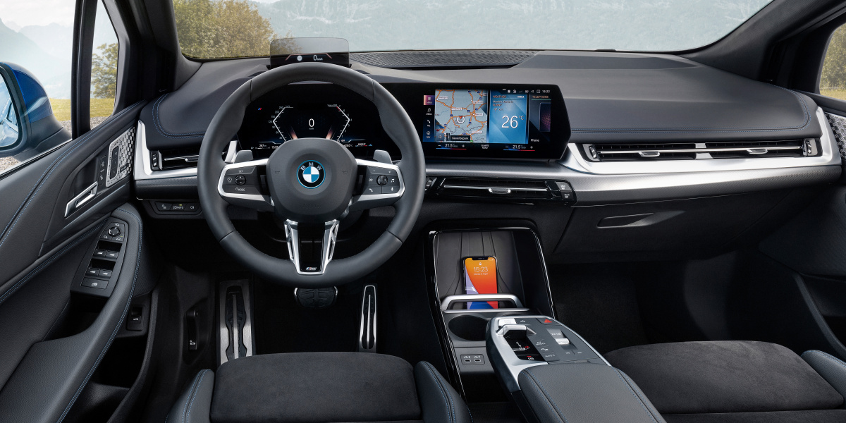 Главной особенностью интерьера новинки в BMW называют изогнутый дисплей, образованный экраном мультимедиа диагональю 10,25 дюйма и 10,75-дюймовой приборной панелью, который вместе с парящим подлокотником отсылает к дизайну салона флагманского электрокроссовера iX. Новый Active Tourer также получил систему iDrive восьмого поколения, которая до этого на машины компакт-сегмента не устанавливалась.