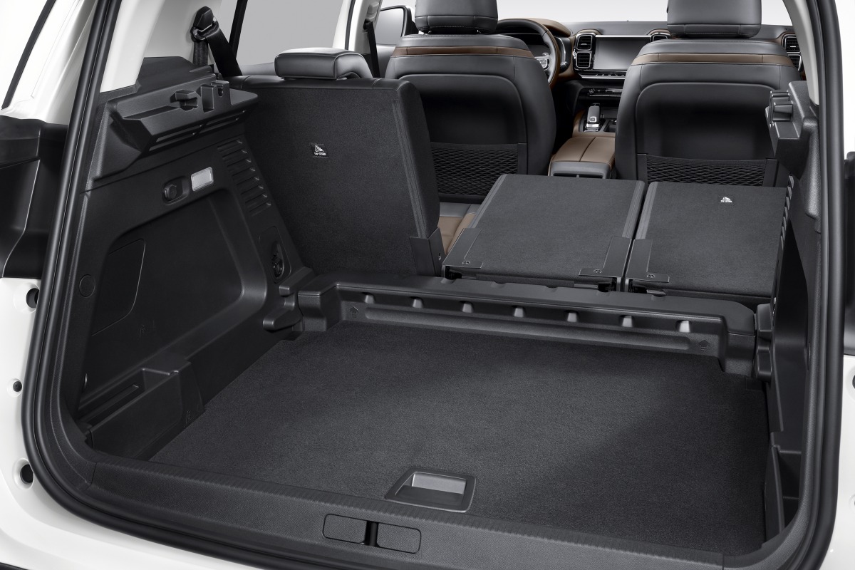 Традиционного заднего «дивана» в новом C5 Aircross нет: вместо него – три раздельных кресла, одинаковых по ширине. Каждое из них можно складывать, сдвигать вперед назад или менять угол наклона спинки, выбирая из пяти фиксированных положений. Объем багажника кроссовера при различном положении задних кресел составляет минимум 580 литров и максимум 1630 л.