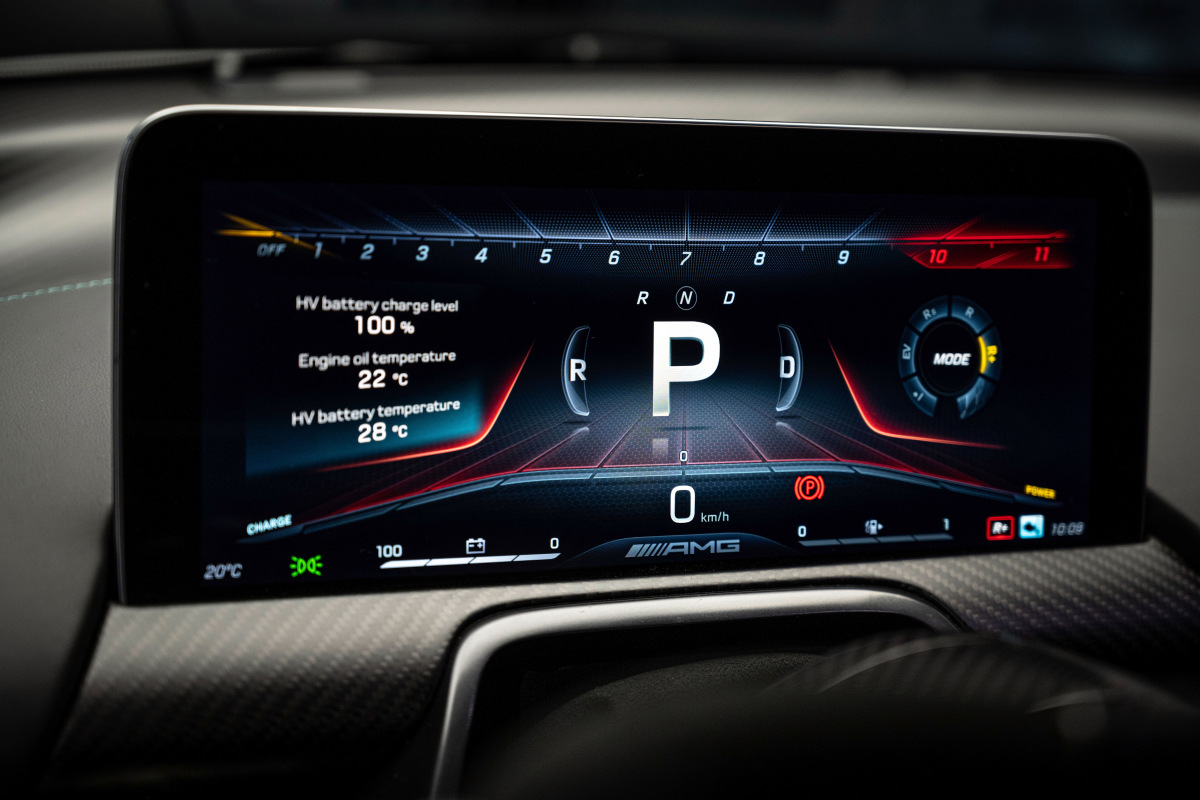 Адаптация гиперкара к европейским дорожным регламентам неизбежно утяжелила машину. Снаряженная масса One – целых 1695 кг, то есть на 400 кг больше, чем планировалось. Поэтому разгонная динамика оказалась даже хуже, чем у представленного еще в 2011 году гибридного McLaren: 100 км/ч с места AMG набирает за 2,9 с (+0,1с), а 200 км/ч – за 7 секунд ровно (+0,2 с). Опередить «британца» удастся только к третьей «сотне», которая покоряется AMG One за 15,6 с (-0,9 с). Максимальная скорость – 352 км/ч.