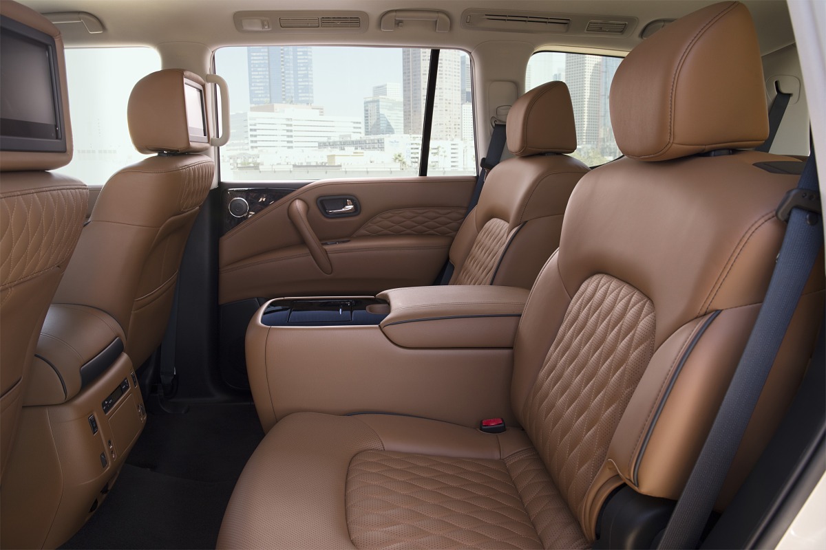 Внутри новый QX80 получил эффектную кожаную отделку с ромбовидной прострочкой – последняя применена на сиденьях и дверных панелях. Мультимедийная система автомобиля стала более современной, нежели на «дореформенной» модели.