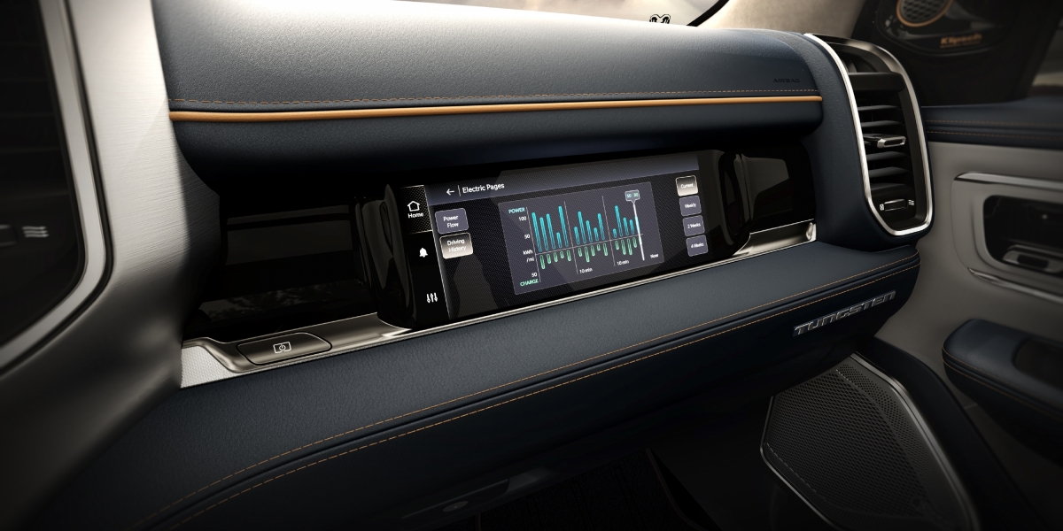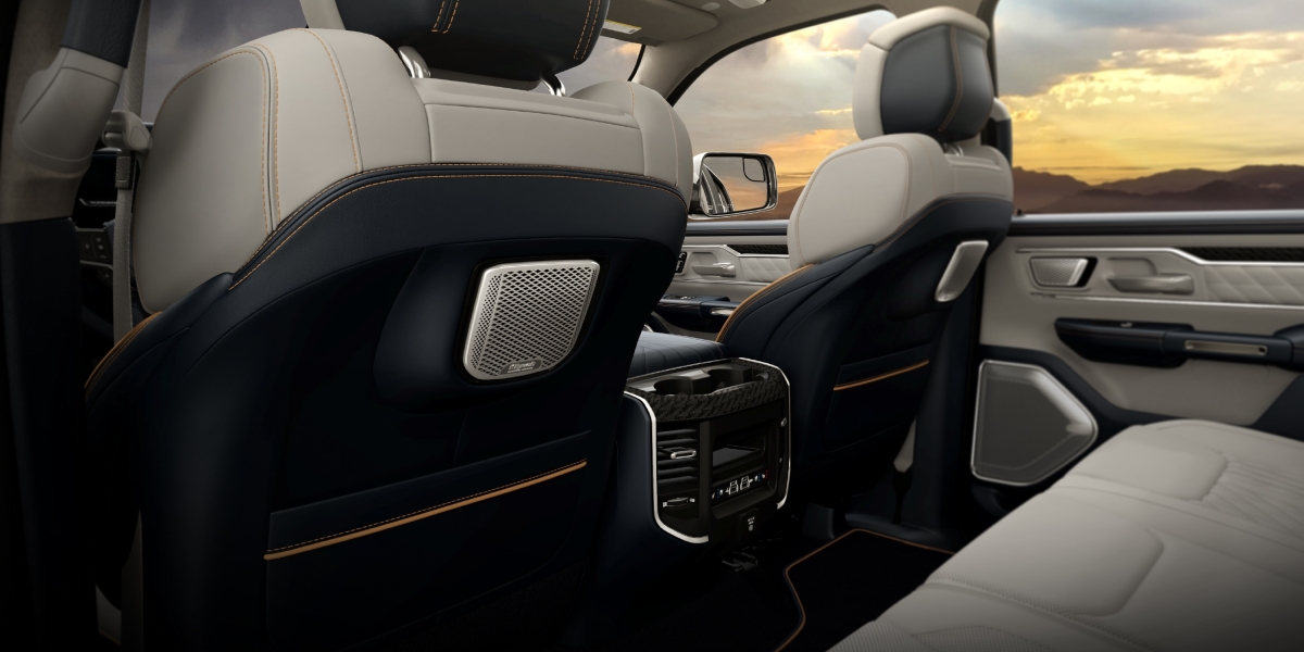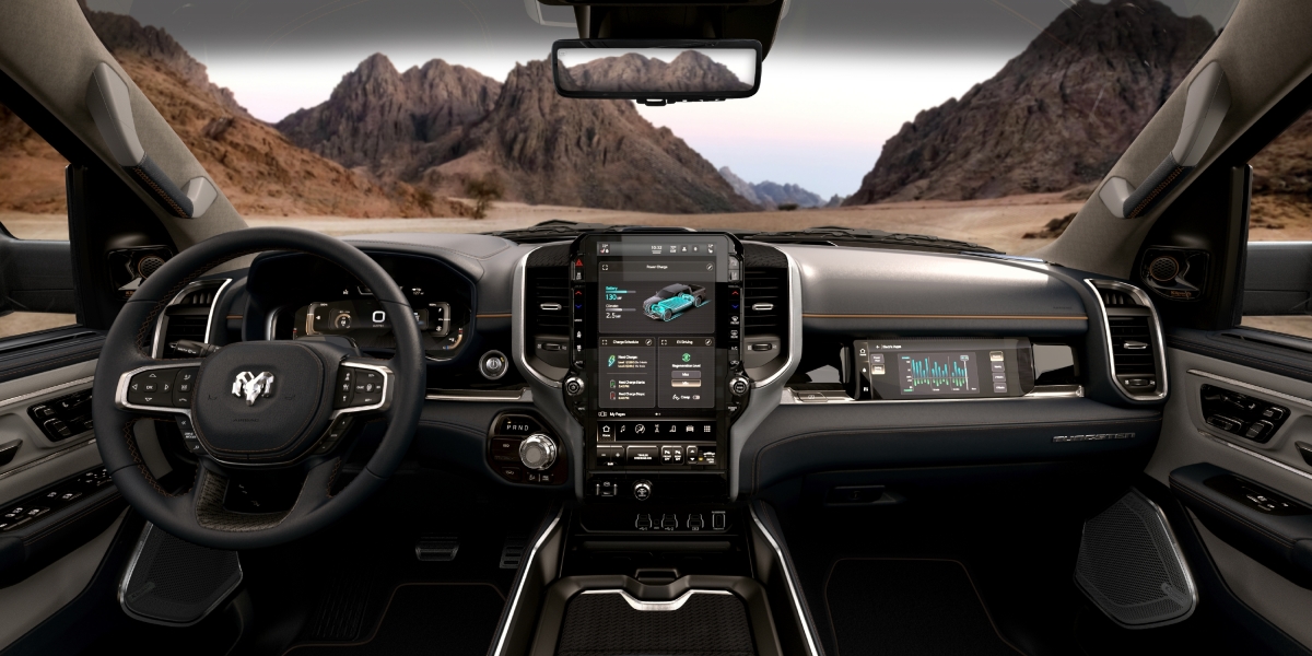 Передняя панель модели досталась от бензинового собрата, однако справа от 14,5-дюймового дисплея мультимедийной системы Uconnect (у версий попроще будет экран диагональю 12 дюймов) расположился пассажирский тачскрин диагональю 10,25 дюйма, на который также можно вывести изображение с камеры заднего вида (салонное зеркало у Ram 1500 REV тоже цифровое). Роль приборной панели выполняет 12,3-дюймовый дисплей, то есть батарейный Ram станет первым серийным пикапом с тремя экранами на передней панели