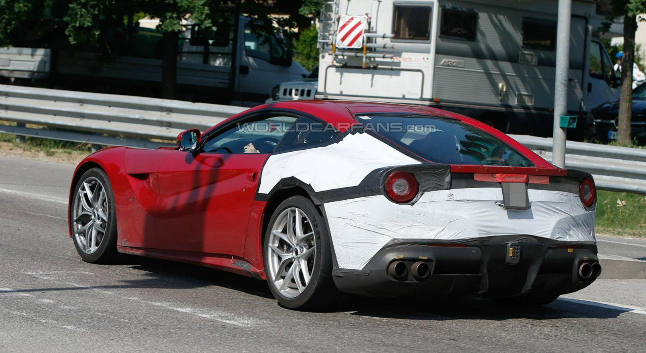 Судя по шпионским фотографиям, обновленная версия F12 Berlinetta, практически ни чем отличаться от своей предшественницы не будет. Единственное, что бросается в глаза так это скрытая под камуфляжной пленкой задняя часть автомобиля, где и ожидаются изменения. Скорее всего, это будет новый бампер и спойлер.