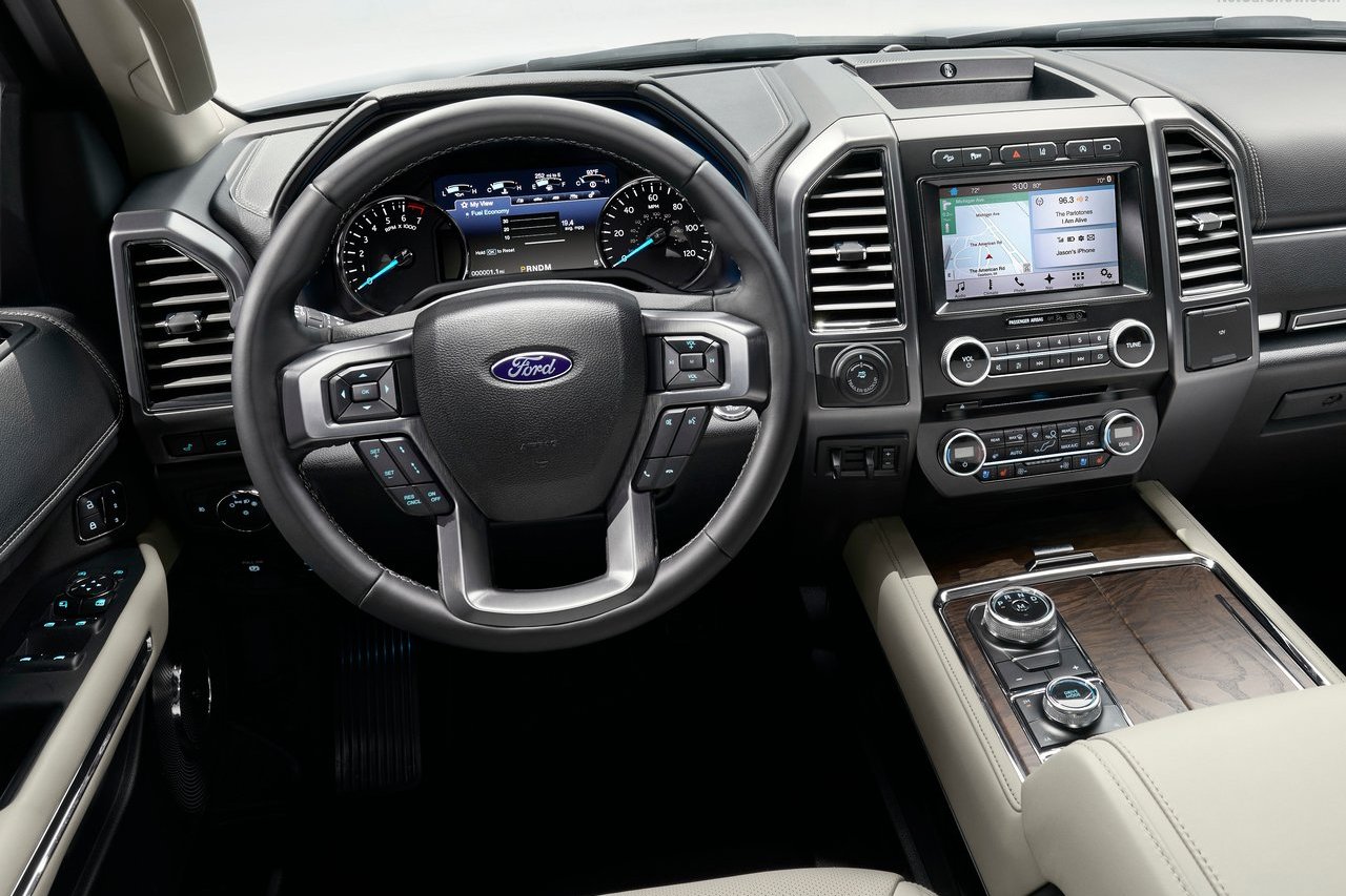 Салон нового Expedition оформлен в слегка грубоватом, но по-своему привлекательном для столь крупного рамного внедорожника стиле. С точки зрения дизайна он напоминает все тот же пикап F-150. Список серийного и опционального оснащения автомобиля пополнился современными электронными системами. В частности, фордовский внедорожник «обучен» самостоятельно парковаться, отслеживать свое положение на полосе, обнаруживать пешеходов и автоматически тормозить в городе; есть также система Start-Stop, адаптивный круиз-контроль и система кругового обзора.
