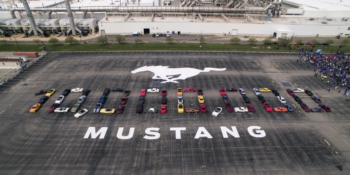 Кроме того, более 60 владельцев Mustang различных поколений собрались у завода во Флэт Роке, чтобы составить автомобилями число, знаменующее очередную веху в производстве модели.