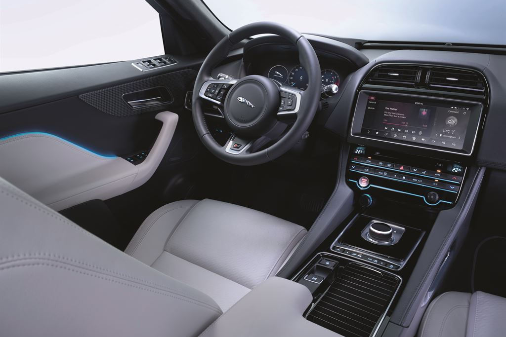 Салон нового F-Pace отделан в духе современных «Ягуаров». Приборная панель представляет собой один большой (12,3 дюйма по диагонали) ЖК-дисплей. Второй экран размером от 8 до 10 с лишним дюймов венчает центральную консоль.