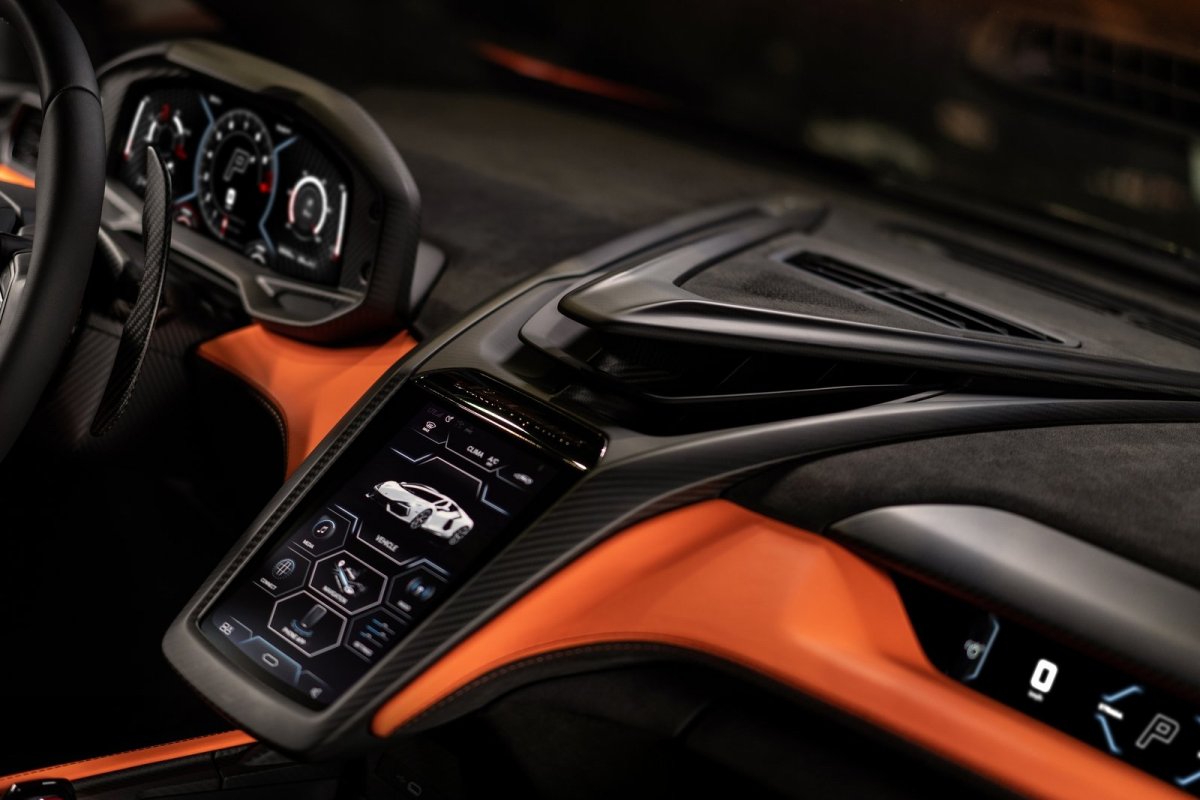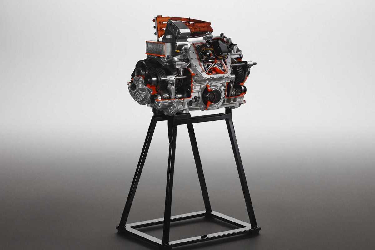 Центральный тоннель сохранен, но вместо карданного вала под ним прячется литий-ионная тяговая батарея емкостью 3,8 кВт·ч. Поэтому мотор V12 у Revuelto развернут коробкой назад: 8-ступенчатый «автомат» почти полностью расположен в заднем свесе. Третий электромотор (100 кВт, 150 Нм) установлен в корпусе коробки передач и может как вращать задние колеса, так и размыкать сцепление и переходить в режим стартер-генератора для подзарядки АКБ и запуска бензинового мотора.