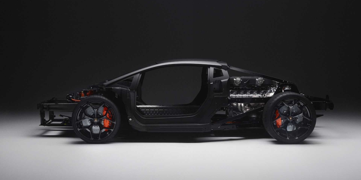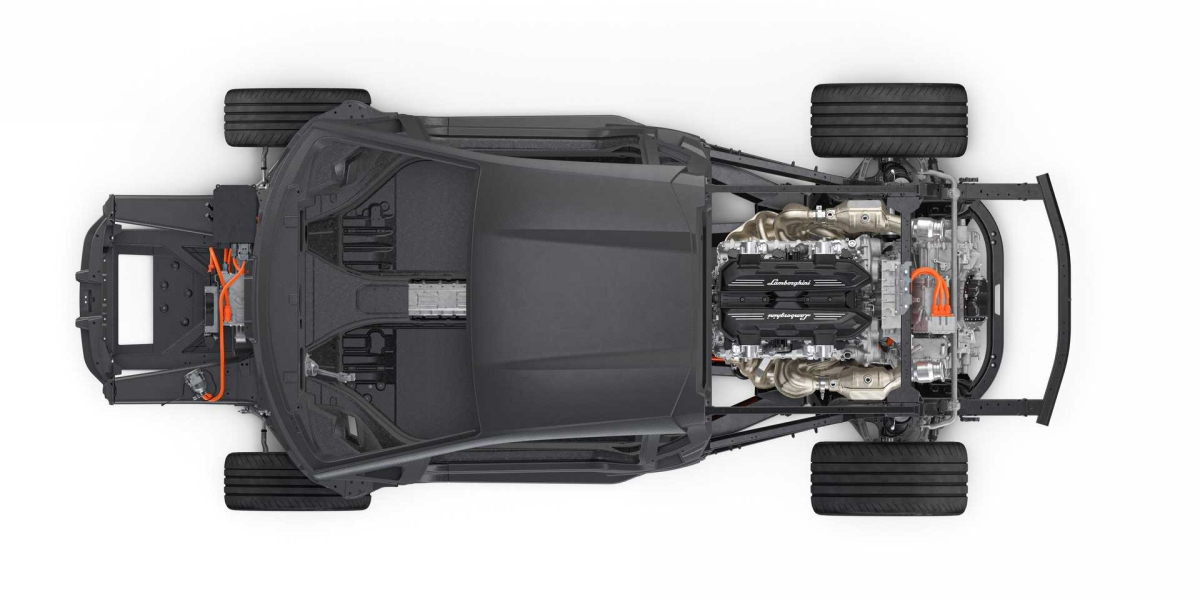 Сохранить массу в разумных пределах позволил полностью карбоновый монокок с передним подрамником, вылепленным из пропитанного смолой короткого углеволокна: это собственная разработка компании, ведущая свою историю с конца 2000-х. В сравнении с аналогичной алюминиевой деталью подрамник Revuelto в два раза лучше гасит вибрации и весит на 20% меньше. В целом же «монофюзеляж» (именно так новую структуру называют в Lamborghini) на 10% легче шасси «Авентадора», а жесткость на кручение у него выше на четверть (40 000 Нм/град).
