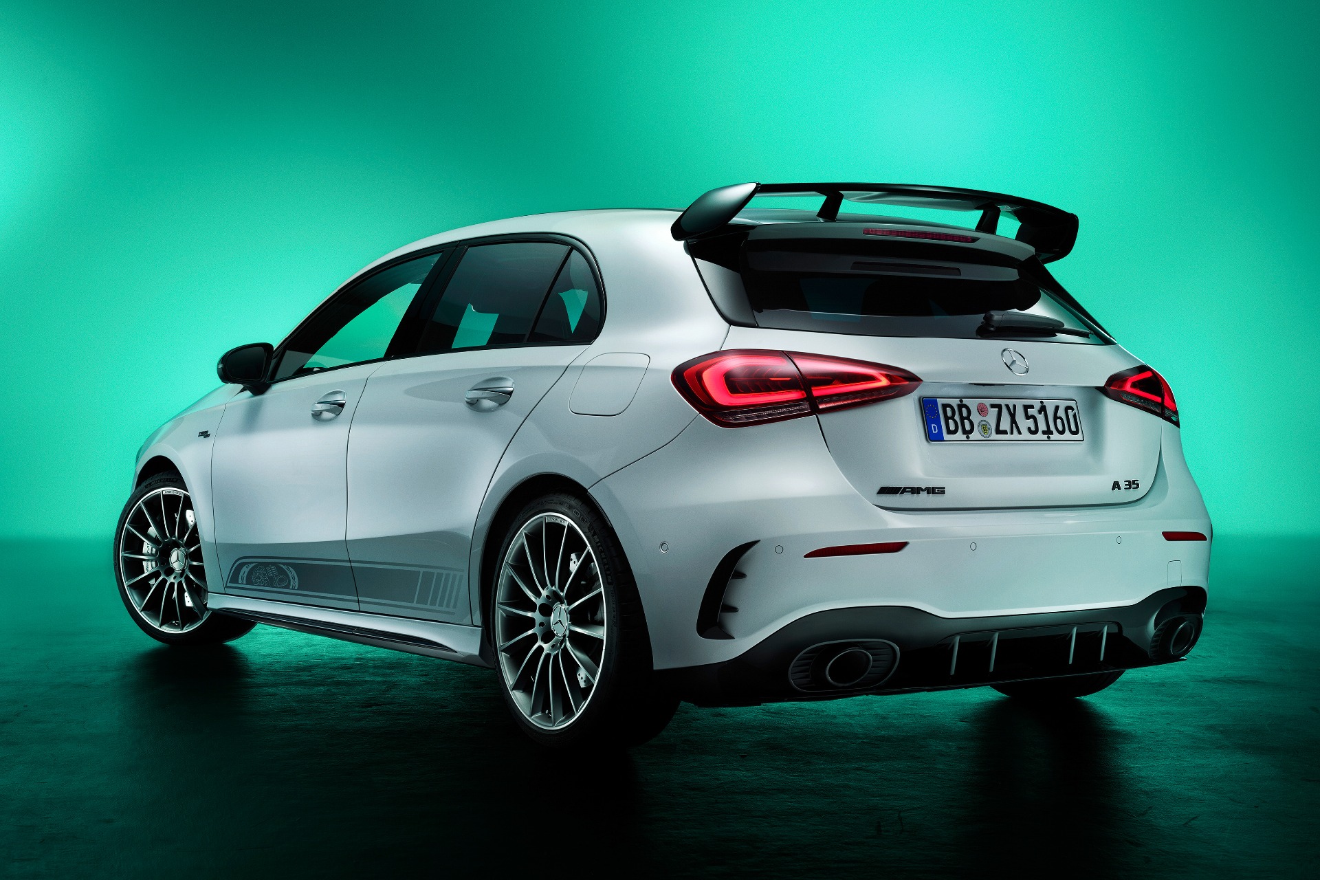 Выделить юбилейные A 35 и CLA 35 также призваны декали с гербом AMG и стайлинг-пакет AMG Night Package: в черный выкрашены корпуса зеркал, рамки бокового остекления, патрубки выхлопной системы, радиаторная решетка и даже шильдики на пятой двери.