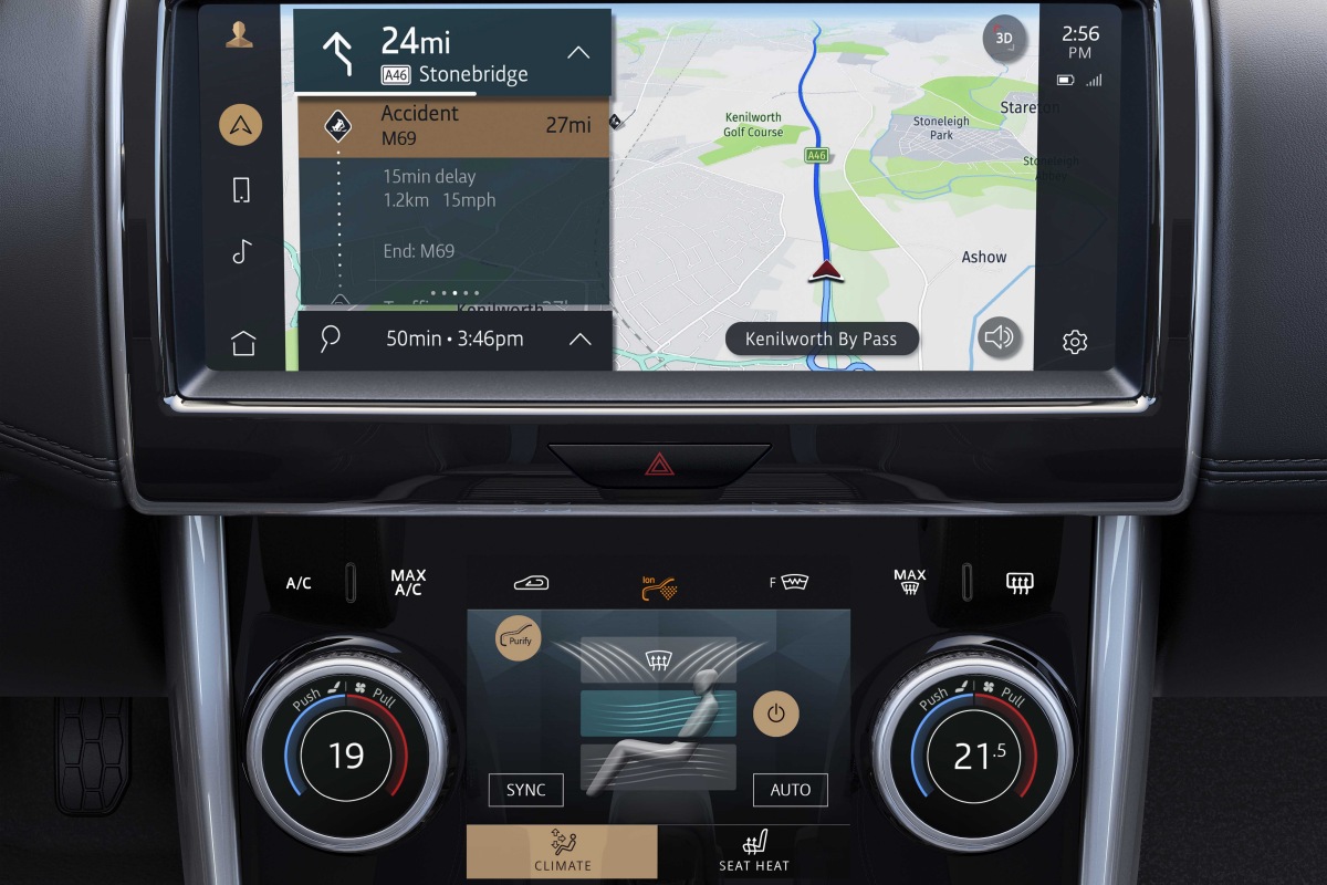 Интерьер XE с точки зрения стиля претерпел лишь «косметические» обновления, зато мультимедийная система – полностью новая: Pivi Pro, используемая на обновленном XF, а также ряде современных моделей Land Rover. Управление системой вынесено на 10-дюймовый центральный дисплей, работа климатической системы контролируется посредством дополнительного 5,5-дюймового экрана; перед глазами водителя – полностью цифровая приборная панель на основе 12,3-дюймового экрана высокого разрешения; есть также проекционный экран.