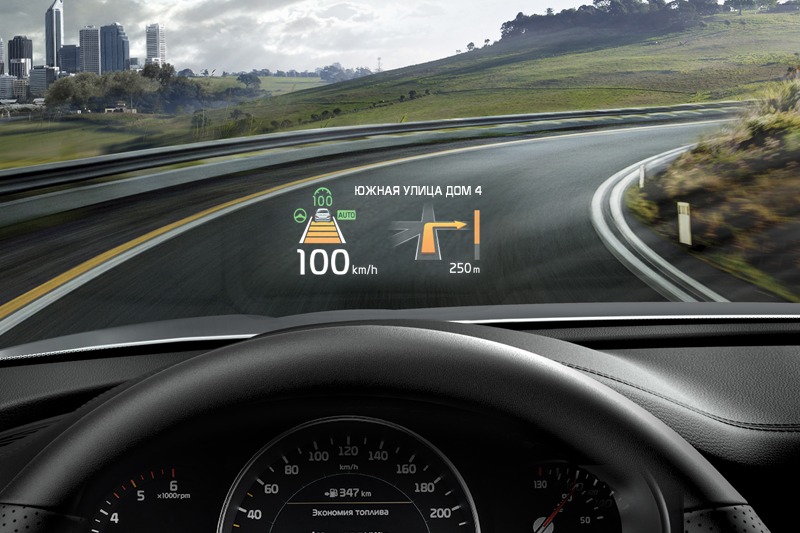 Информация проецируется на лобовое стекло, что, как отмечают специалисты Kia, «положительно сказывается на уровне безопасности».