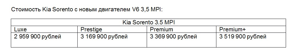 В зависимости от комплектации цена Kia Sorento с новым двигателем составит от 2 959 900 до 3 519 900 рублей. Новый агрегат дополнит линейку моторов состоящую из бензинового 2.5 MPI и дизельного 2.2 CRDi.