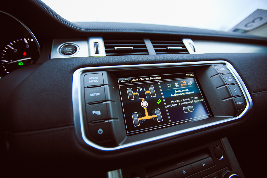 Потенциал у гламурного модника и дамского угодника и впрямь очень неплохой. 190-сильный тяговитый дизель, отличный клиренс в 212 мм, короткие свесы и, конечно, фирменная система Terraine Responce, позволяющая заранее перевести всю страховочную электронику в соответствующий внедорожный режим, коих у машины целых пять. Самое интересное, что всё это – не баловство. Лендроверовская мехатроника реально помогает водителю очень эффективно бороться с действительностью, в чем раз от раза убеждались представительницы прекрасной половины человечества – основная аудитория привлекательного «Эвока».