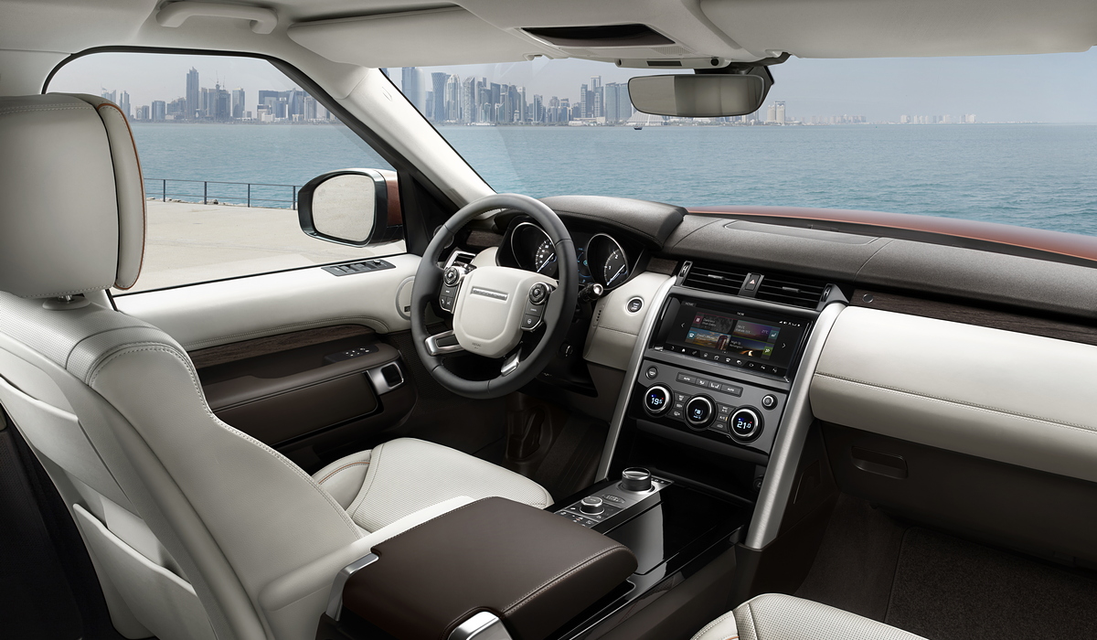 Интерьер Discovery V оформлен в стилистике современных «Рэйндж Роверов», главное же новшество здесь – третий ряд сидений: автомобиль способен «принять на борт» семерых. В списке доступного оснащения – новая мультимедийная система InControl Touch Pro с сенсорным дисплеем диагональю 10 дюймов, 3G точкой доступа в Интернет, возможностью раздачи Wi-Fi на восемь мобильных устройств и интерфейсом для интеграции со смартфонами на платформах iOS и Android. Аудиофилы смогут заказать опциональную «акустику» Meridian.