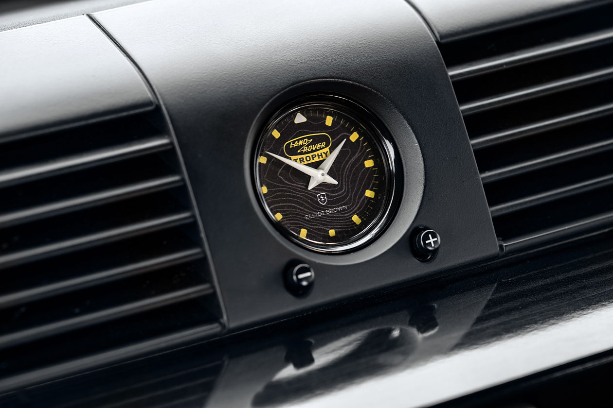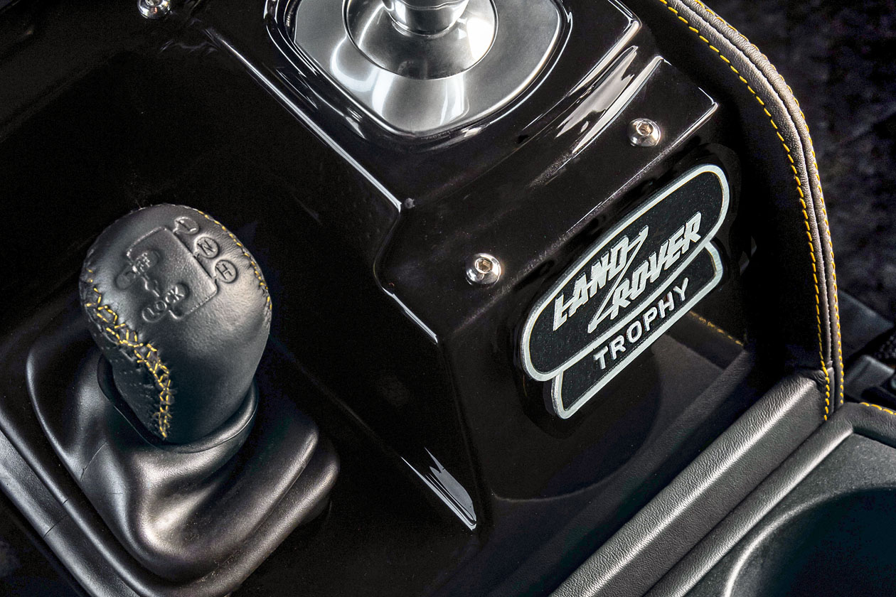 Внутри новый Defender Works V8 Trophy отделан черной кожей Windsor с контрастной желтой прострочкой; внедорожник получил также спортивные сиденья Recaro и сделанные на заказ механические часы Land Rover Trophy от Elliot Brown. Кроме того, в автомобиле установлена мультимедийная система Classic со встроенной навигацией и функцией подключения мобильных устройств, разработанная специалистами подразделения Land Rover Classic.