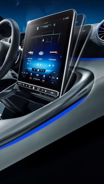 На центральной консоли будет расположен 11,9-дюймовый монитор медиасистемы MBUX с электрической регулировкой по углу наклона и дополнительными датчиками AMG. Mercedes заявляет, что в вертикальном положении дисплей почти не бликует.