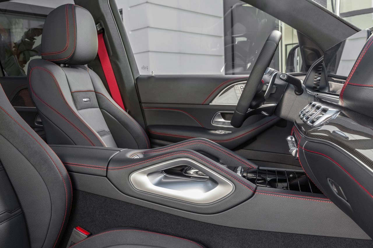 Салон автомобиля выполнен из кожи и алькантары черного цвета с красными вставками. Новинка получила информационно-развлекательную систему MBUX, а также специальное меню AMG.