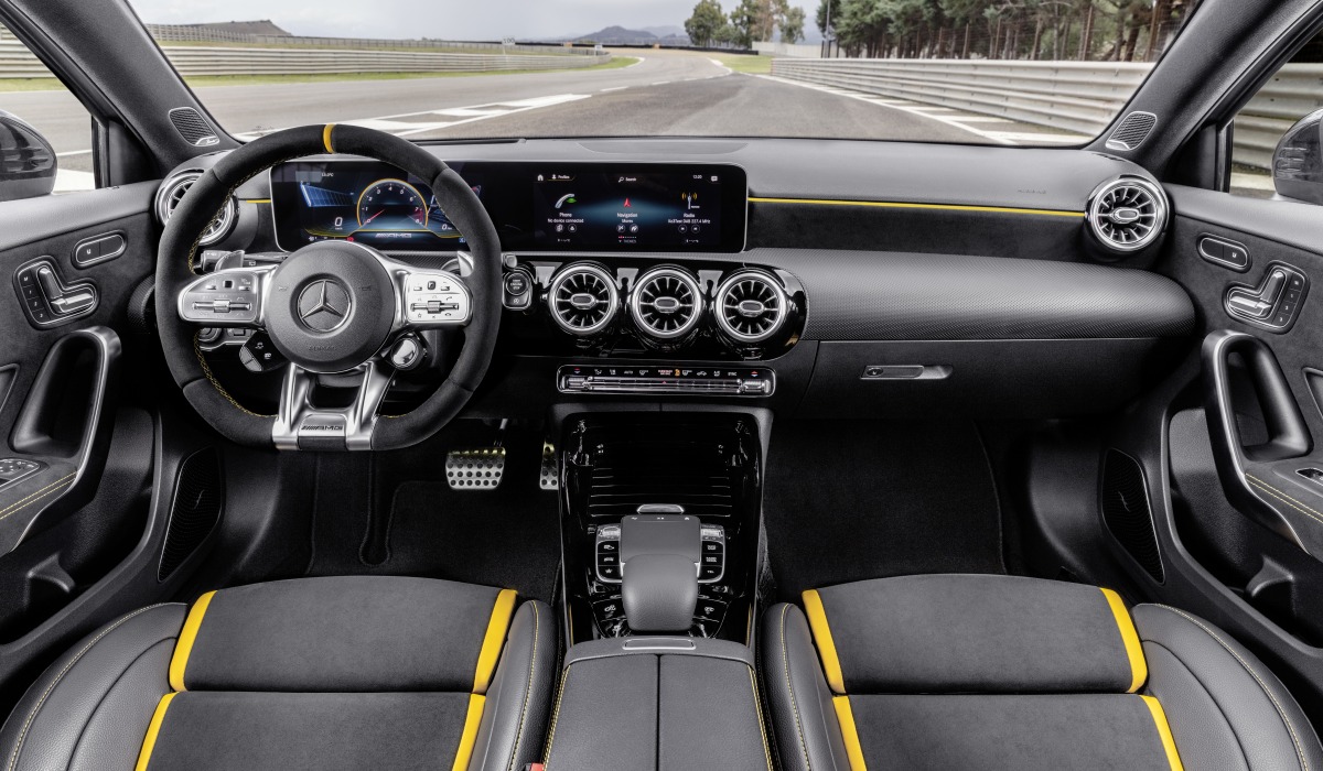 Внутри новые A 45 и CLA 45 оформлены в характерном для моделей AMG гоночном стиле, кроме того, автомобили уже «в базе» оснащены новой мультимедийной системой MBUX. Стандартный вариант отделки салонов машин – комбинация кожи Artico ручной выделки и микрофибры Dinamica. Автомобили в версиях S отделываются кожей Nappa с декоративными вставками и прострочкой желтого цвета.