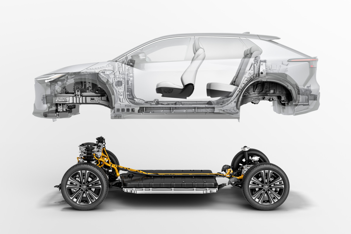 Новый паркетник построен на электрической платформе e-TNGA (e-Toyota New Global Architecture) и по габаритам немного превосходит RAV4: длина – 4690 мм, ширина – 1860 мм, высота – 1650 мм при длине колесной базы 2850 мм.